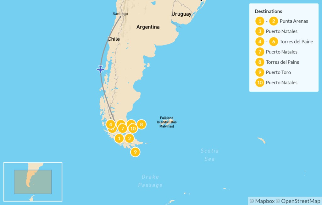 Map of Chilean Patagonia: Wildlife, W Trek, Ice Hiking, & Kayaking – 11 Days