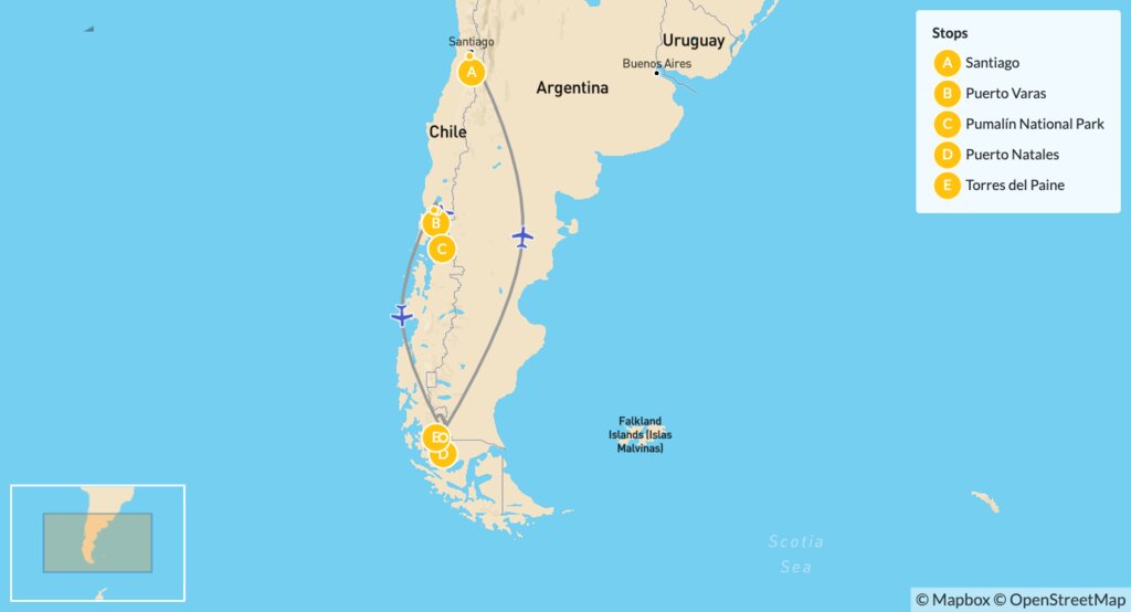 Map of Chilean Patagonia’s National Parks & Outdoor Highlights – 14 Days