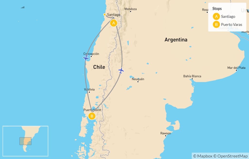 Map of Chile’s Capital, Wine Country & Lake District – 10 Days