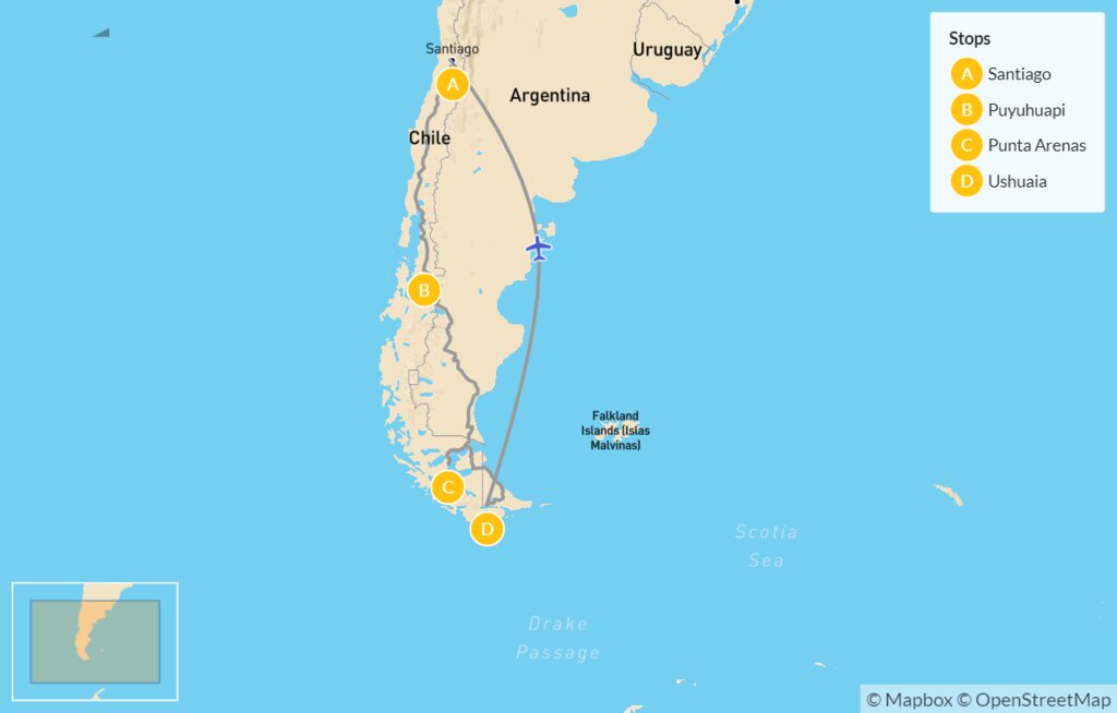 Map of Chile’s Ultimate Outdoor Attractions: Santiago, Aysén Region & Patagonia – 14 Days