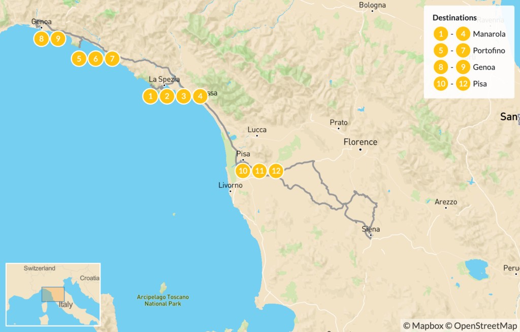 | Day 1 | Arrive in Pisa, Travel to Cinque Terre & Evening Cruise | Manarola |