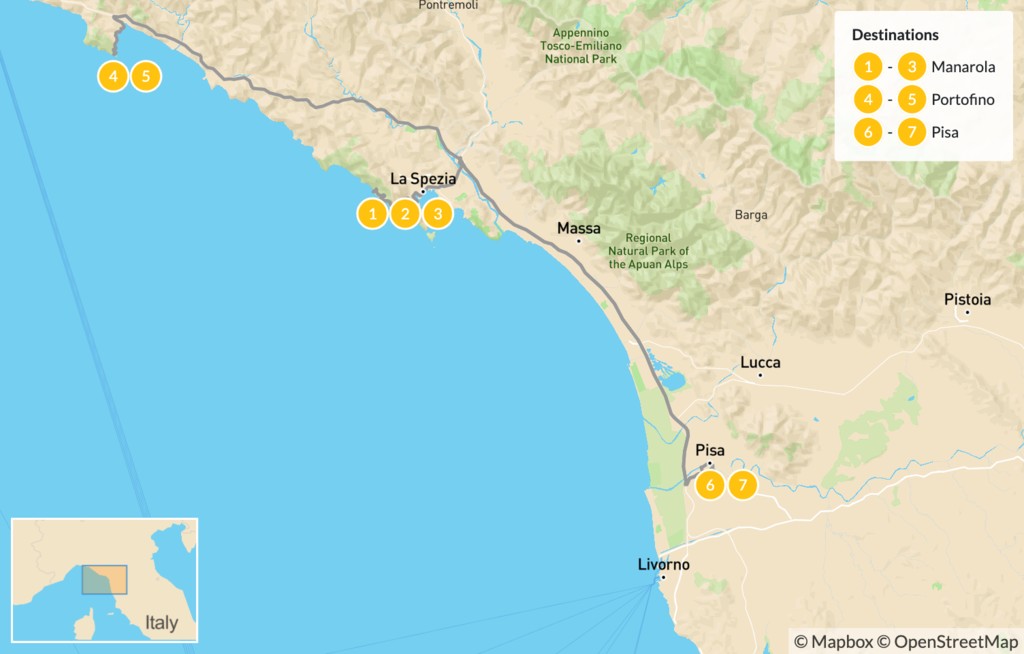 | Day 1 | Arrive in Pisa, Travel to Cinque Terre & Evening Cruise | Manarola |