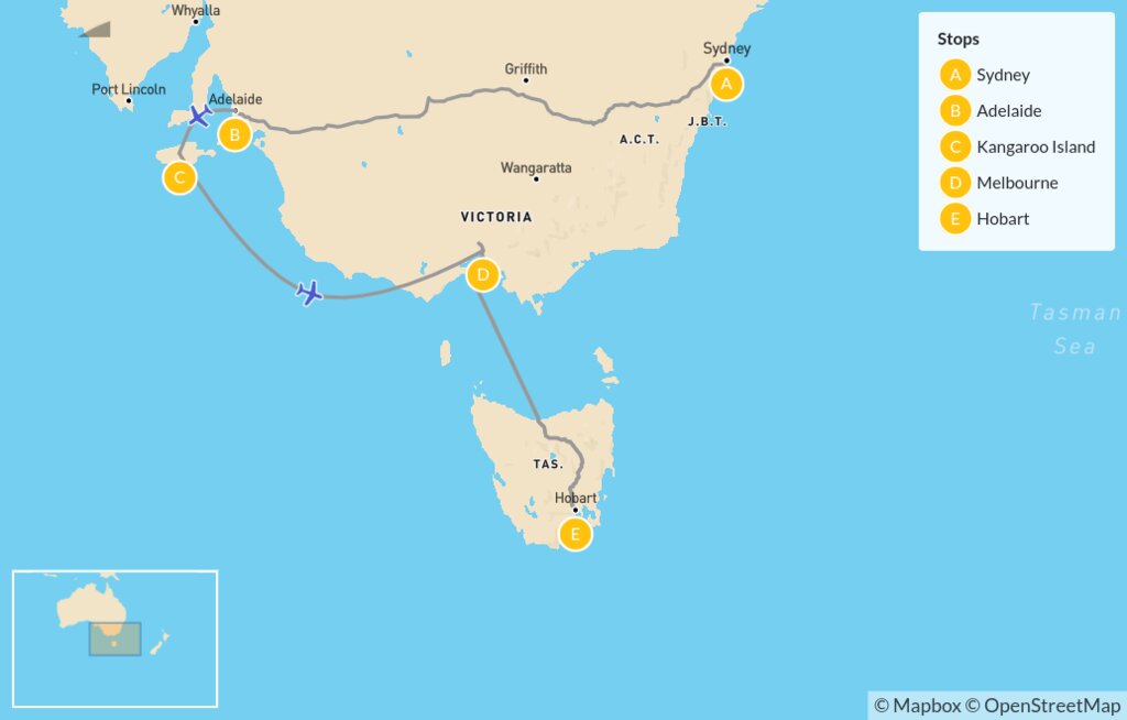 Map of City Highlights, Nature & Wildlife: Sydney, Melbourne, Adelaide, Kangaroo Island & Tasmania – 13 Days