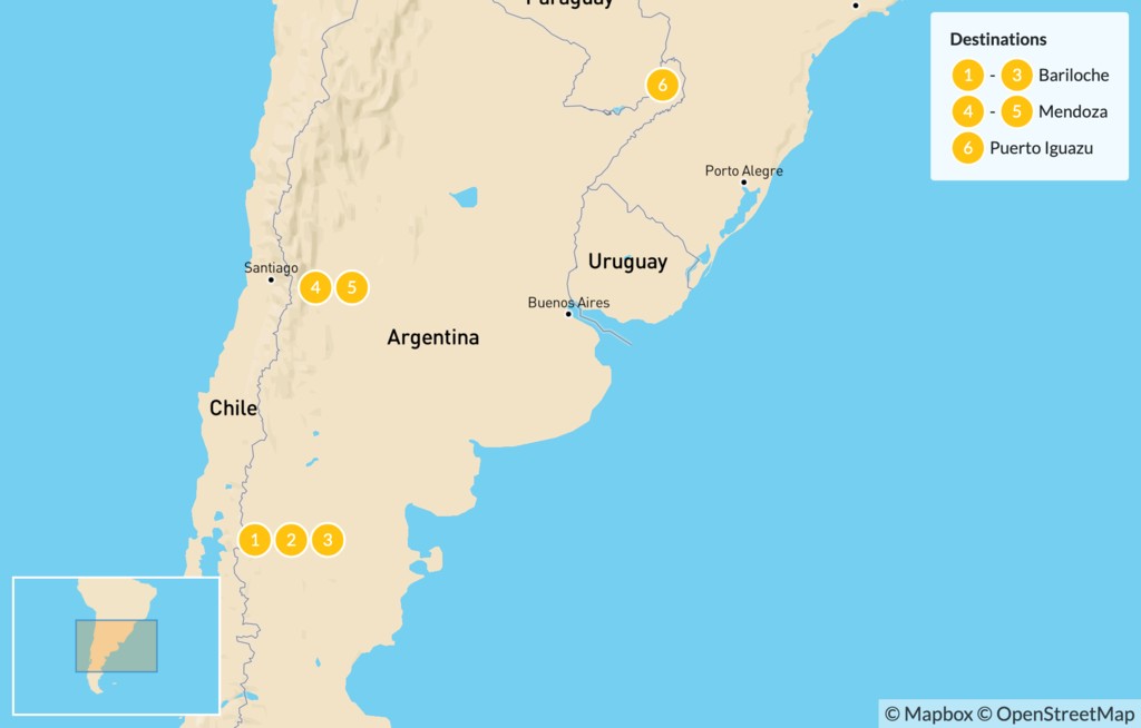Map of Classic Argentina: Bariloche, Mendoza, & Iguazú – 7 Days