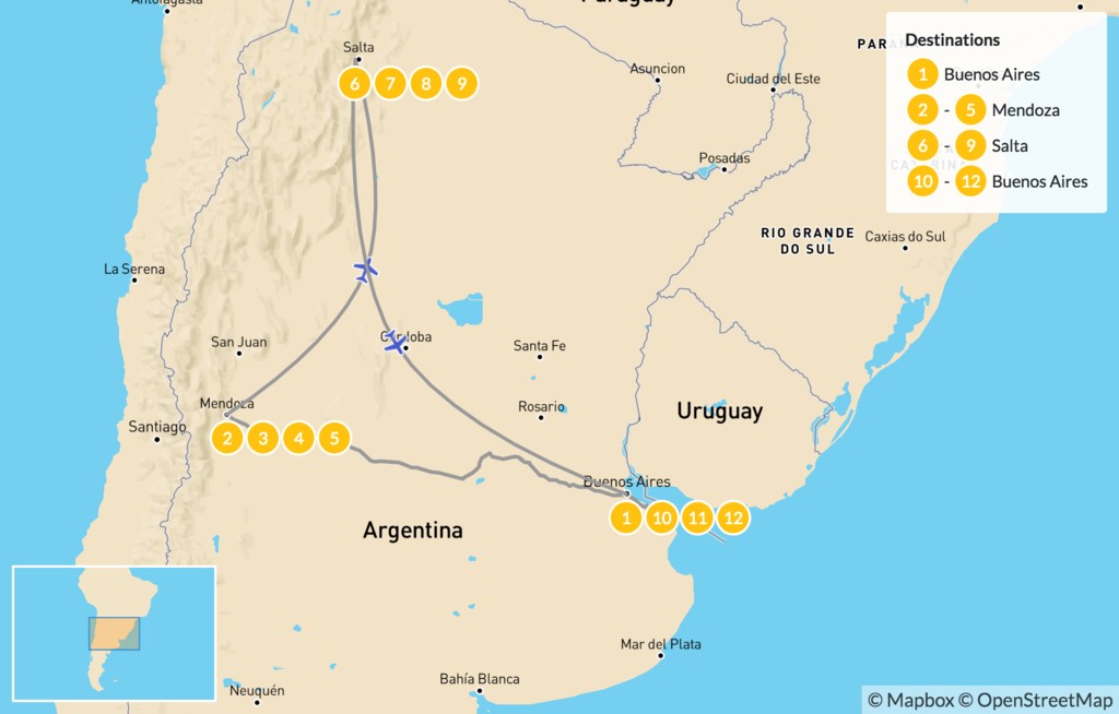Map of Classic Argentina: Buenos Aires, Mendoza, & Salta – 13 Days