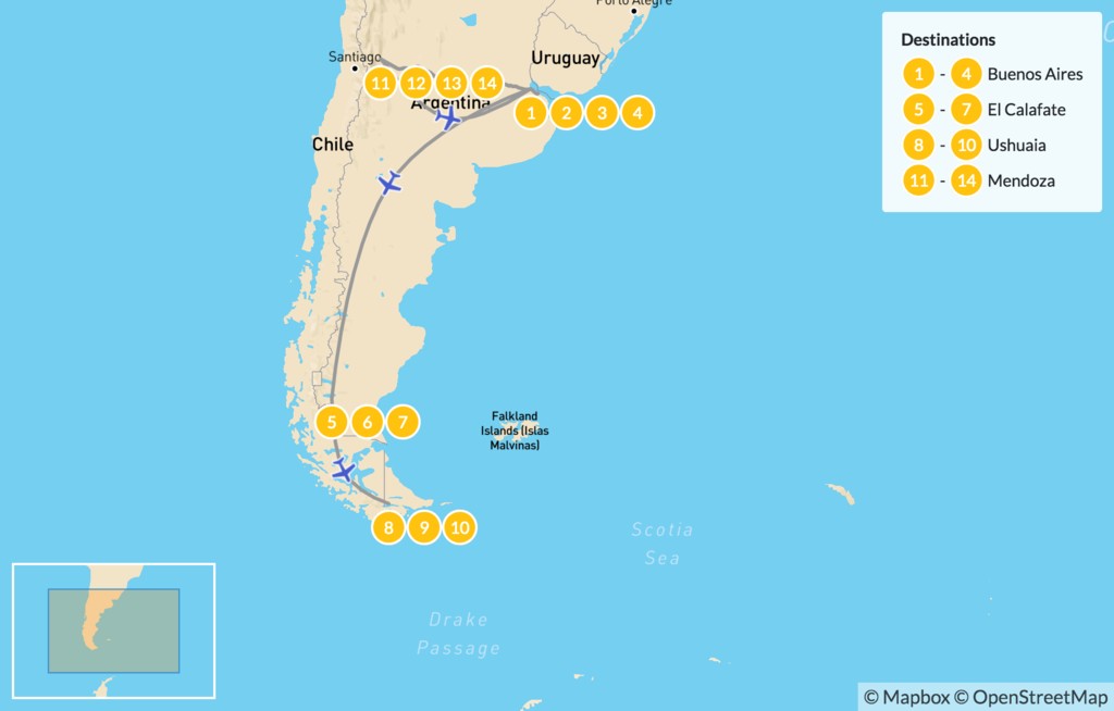 Map of Classic Argentina: Buenos Aires, Patagonia, & Mendoza – 15 Days