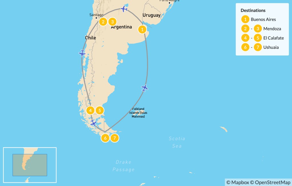 Map of Classic Argentina: Mendoza & Patagonia – 8 Days