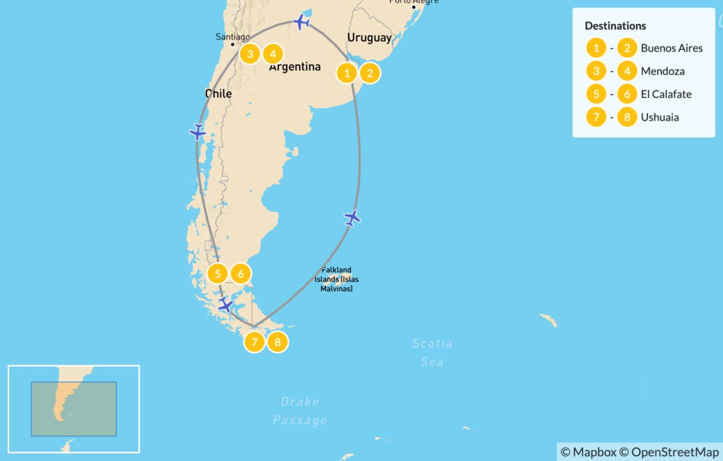 Map of Classic Argentina: Mendoza & Patagonia – 9 Days