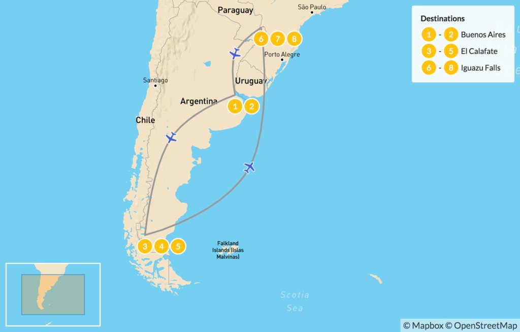 Map of Classic Argentina: Patagonia & Iguazú – 9 Days