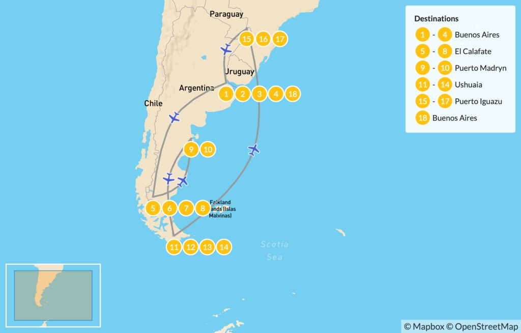 Map of Classic Argentina: Patagonia & Iguazú Falls – 19 Days