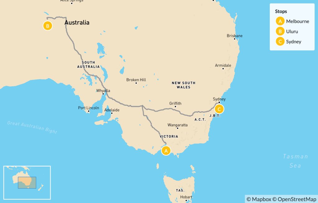 Map of Classic Australia: Melbourne, Uluru & Sydney – 12 Days