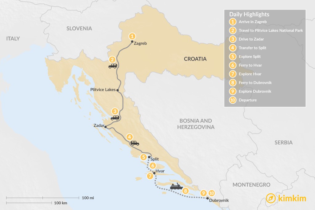Map of Classic Croatia: Zagreb, Plitvice, Hvar & Dubrovnik – 10 Days