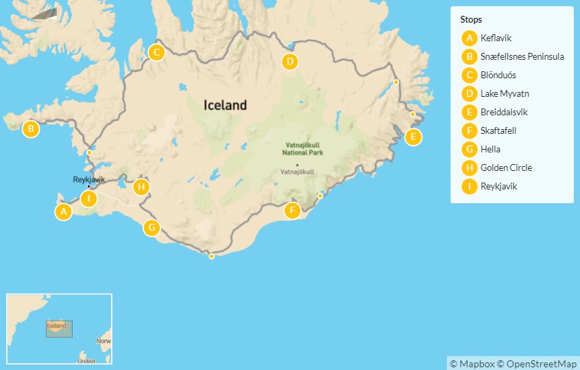 Map of Classic Iceland Ring Road Adventure: Snaefellsnes & Vatnsnes Peninsulas & Golden Circle – 11 Days