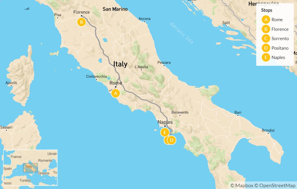 Map of Classic Italian Honeymoon: Rome, Florence & Amalfi Coast – 10 Days
