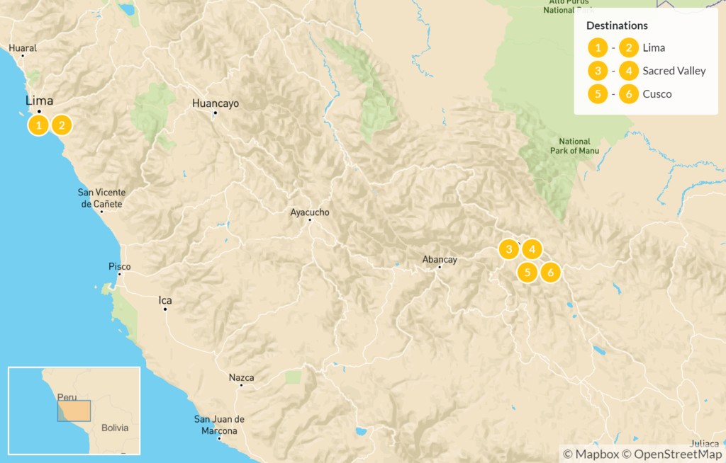 This classic route through Peru introduces you to the country’s top attractions for an immersive experience in seven days. See the contrast between old and new Lima, visit ancient archaeological wonders and textile communities in the Sacred Valley, and marvel at the majestic ruins of Machu Picchu. You’ll also spend a day and a night in the beautiful colonial city of Cusco for your fill of treasures from its Inca and Spanish legacy.