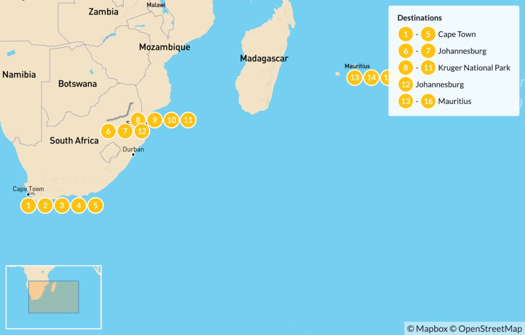 Map of Classic South Africa and Mauritius: Cape Town, Johannesburg, Kruger Safari, & More – 17 Days