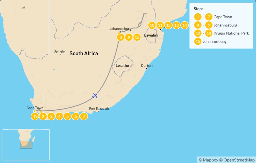 Map of Classic South Africa: Cape Town, Johannesburg & Kruger Safari – 16 Days