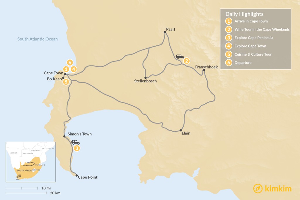 Map of Classic South Africa: Cape Town, Winelands, & Cape Point – 6 Days