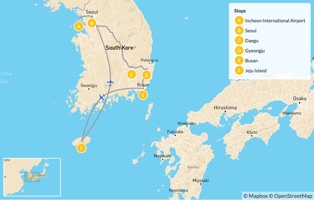 Map of Classic South Korea: Seoul, Daegu, Gyeongju, Busan & Jeju Island – 12 Days