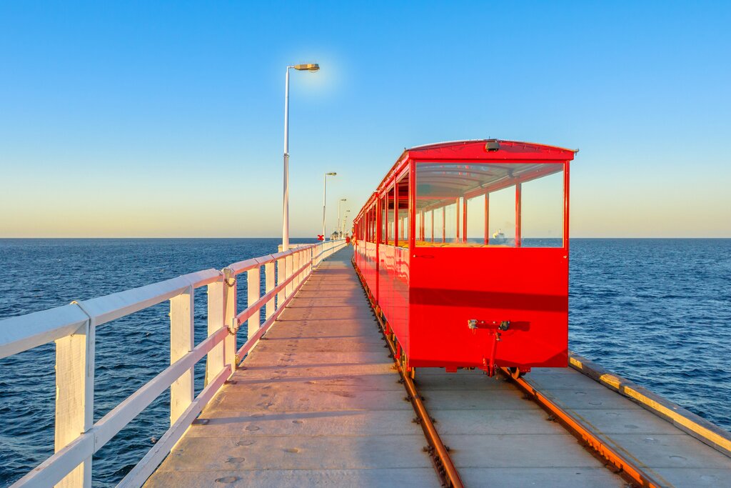 After a relaxed morning in Margaret River, make the return three-hour journey up the coast to Perth. Pause at the seaside town of Busselton to stretch your legs, where you’ll find the 150-year-old Busselton Jetty, the longest wooden jetty in the Southern Hemisphere. Walk the 1.1-mile (1.7 km) stretch or take the miniature train to the end. Step into the Underwater Observatory, a circular room studded with windows 26 feet (8 m) beneath the ocean’s surface. They reveal up to 300 species of colorful coral, fish, and other marine life fed by an unusually warm current.