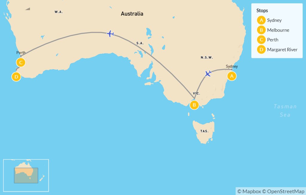 Map of Coast-to-Coast Australian Cities: Sydney, Melbourne & Perth – 16 Days