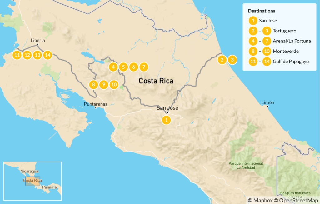 This 15-day adventure allows you to experience the country from both coasts and is designed from start to finish with kids in mind. You’ll visit the bustling capital of San José, the rainforest of Tortuguero National Park, the towering Arenal Volcano, the cloud forest of Monteverde and the spectacular beaches of Guanacaste. There are plenty of family-friendly activities along the way, from watching sea turtles hatch on a Caribbean beach to sampling locally produced chocolate to snorkeling in the Pacific.