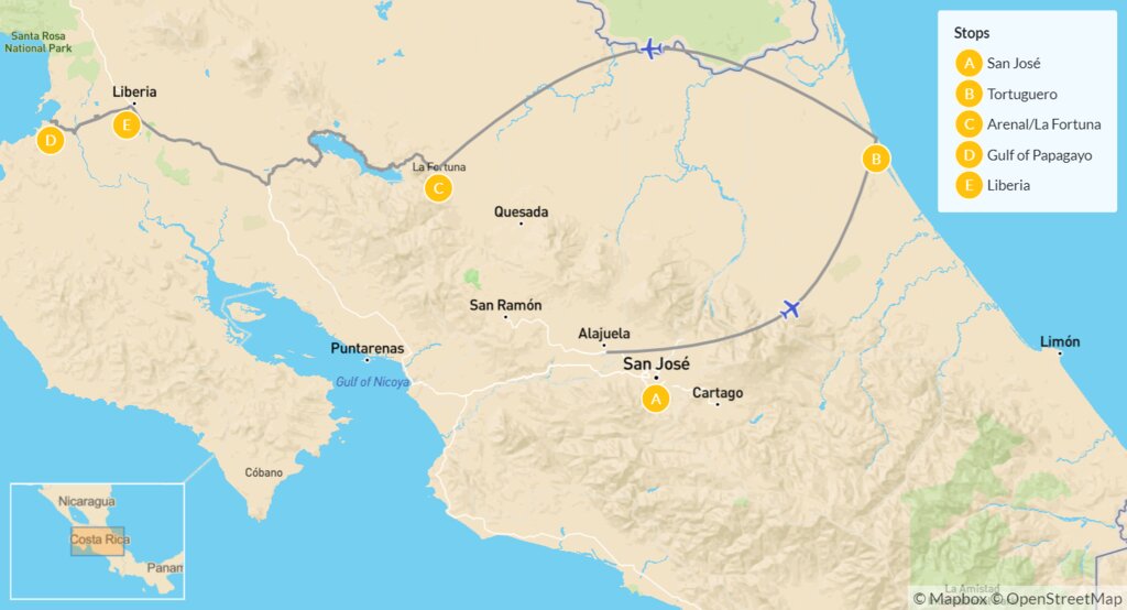 Map of Coast-to-Coast Luxury in Costa Rica: Tortuguero, Arenal & Papagayo – 10 Days