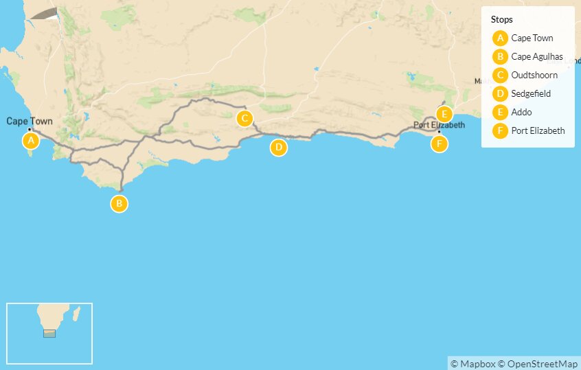 Map of Coastal South Africa: Cape Town, Garden Route & Big Five Tour – 7 Days