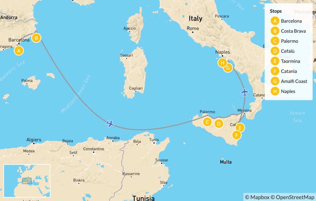 Map of Coastal Spain & Southern Italy Trip: Barcelona, the Costa Brava, Sicily & the Amalfi Coast – 14 Days