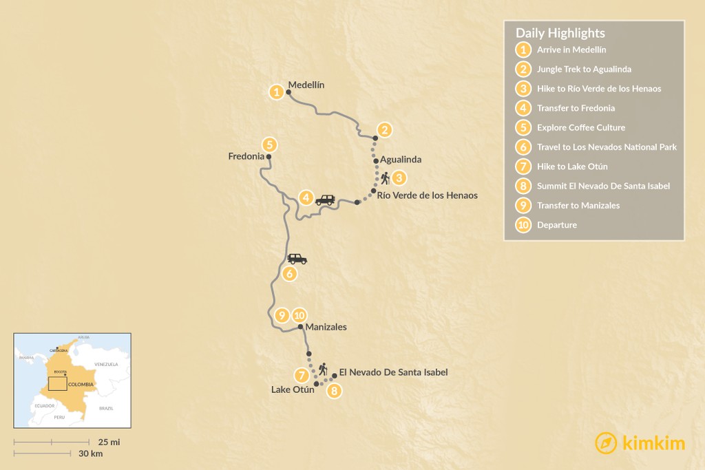 Map of Coffee Country and Trekking Los Nevados – 10 Days