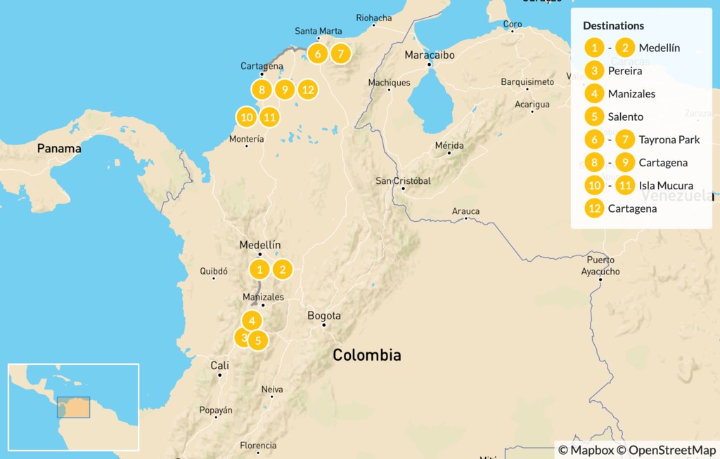 Map of Colombia Adventure: Zona Cafetera, Tayrona Park, & Caribbean Coast – 15 Days