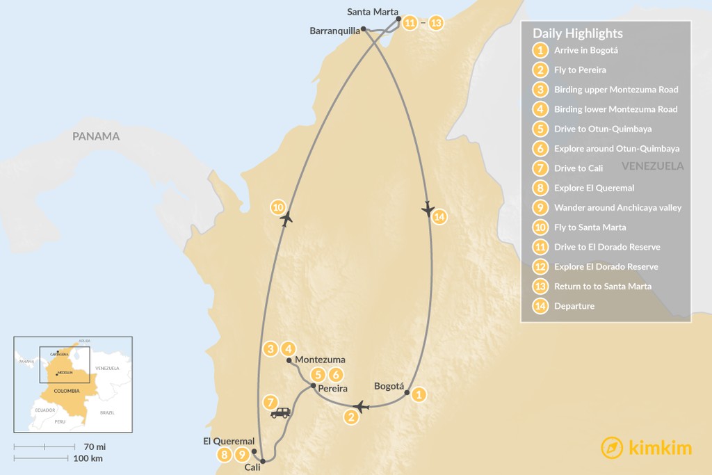 Map of Colombia Epic Birdwatching Tour: Western Andes & Santa Marta – 14 Days