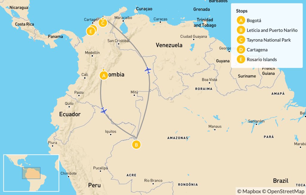 Travel the length of Colombia, from the Caribbean Sea to the Amazon River, on an epic adventure spanning 13 days. You’ll arrive in the capital and visit Bogotá’s colonial center, then fly south to embark on excursions deep into the Amazon jungle. Finish the trip with a greatest hits tour of the northern coast that includes Tayrona National Park and yacht trips around the bay of Cartagena.