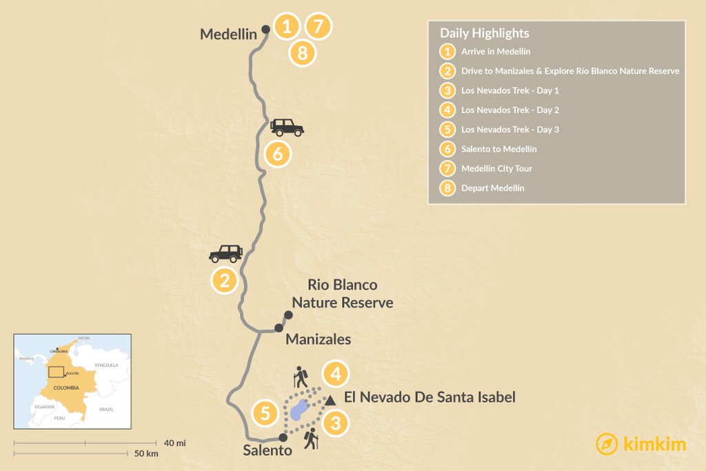 Map of Colombia Outdoor Adventure: Medellín & Los Nevados Trek – 8 Days