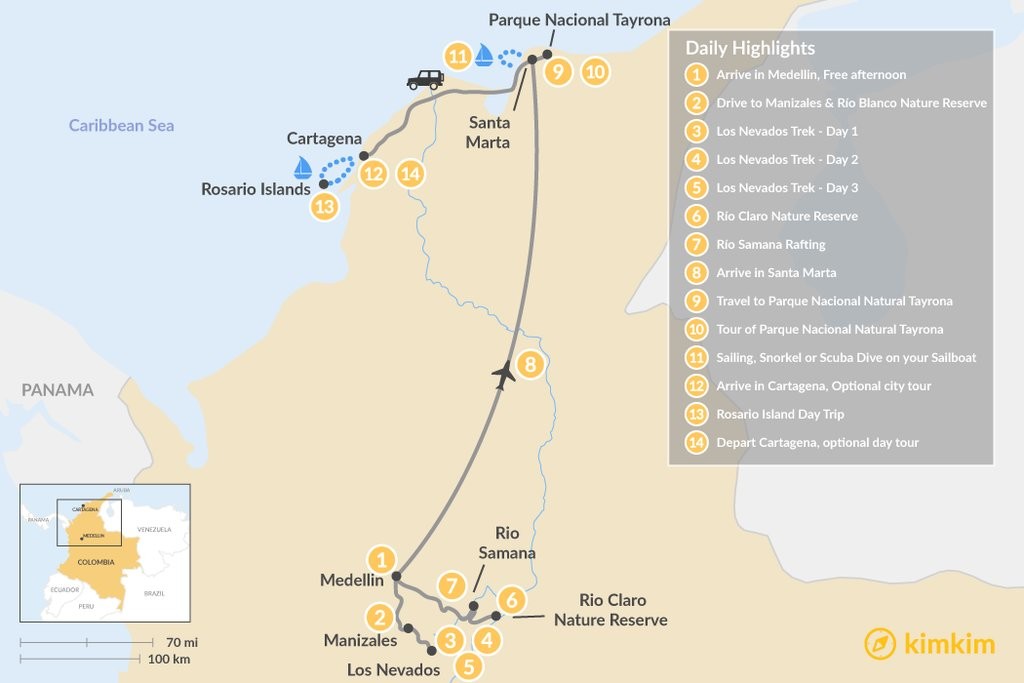 Map of Colombia Summit to the Sea Adventure – 14 Days