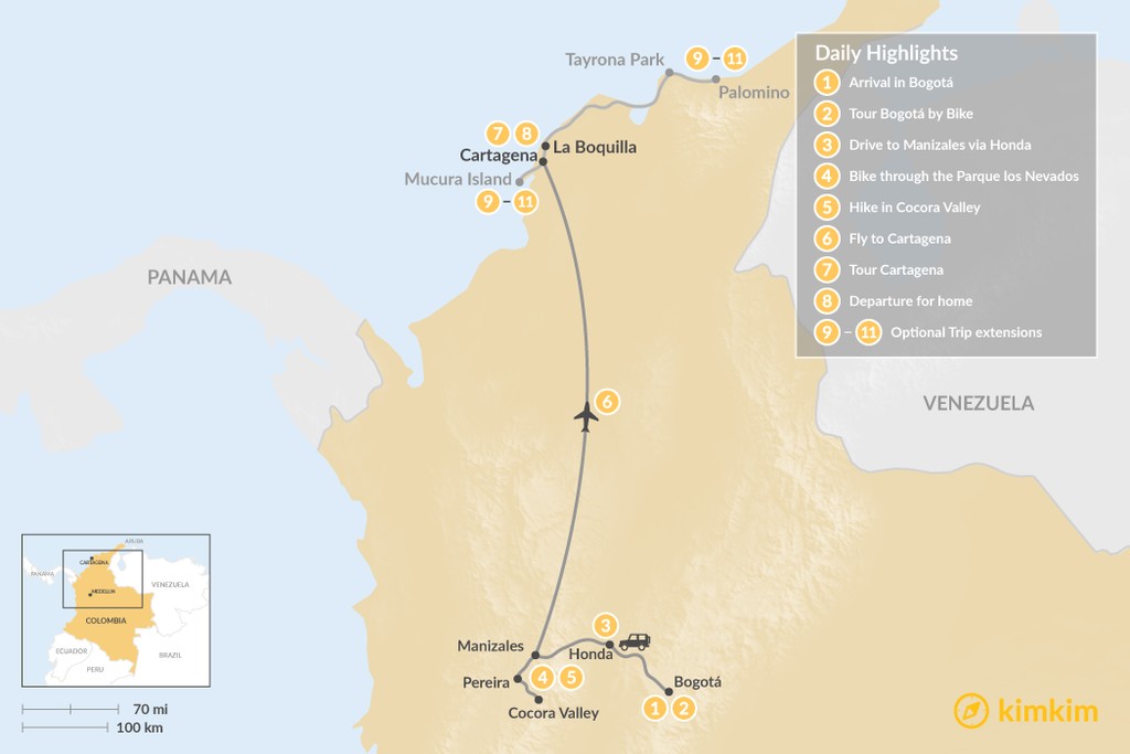 Map of Colombian Andes to the Caribbean: 10-Day Itinerary