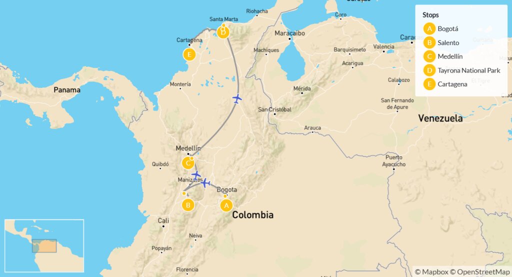 Map of Colombian Andes to the Caribbean Coast: Bogotá, Salento, Medellín, Tayrona & Cartagena – 16 Days