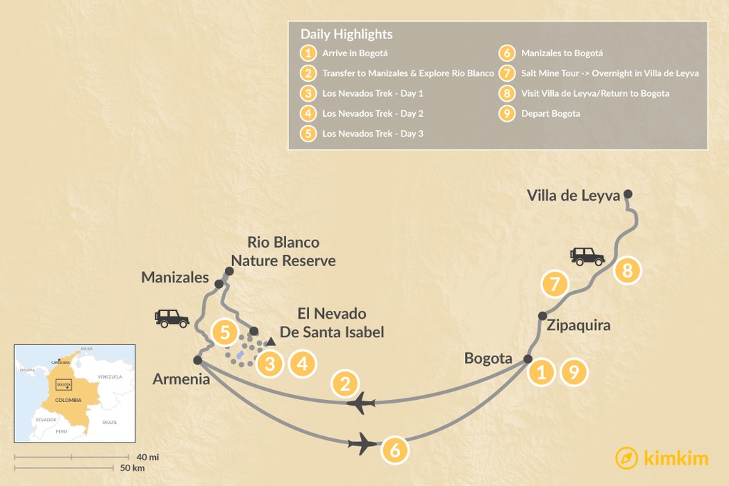 Map of Colombian Highlands & the Los Nevados Trek – 9 Days