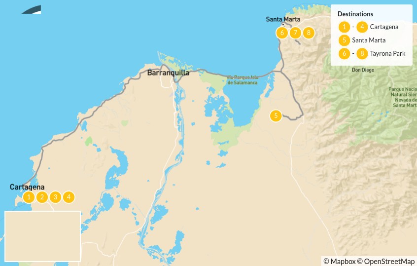 Map of Colombia’s Caribbean Coast: Tayrona & Cartagena – 9 Days