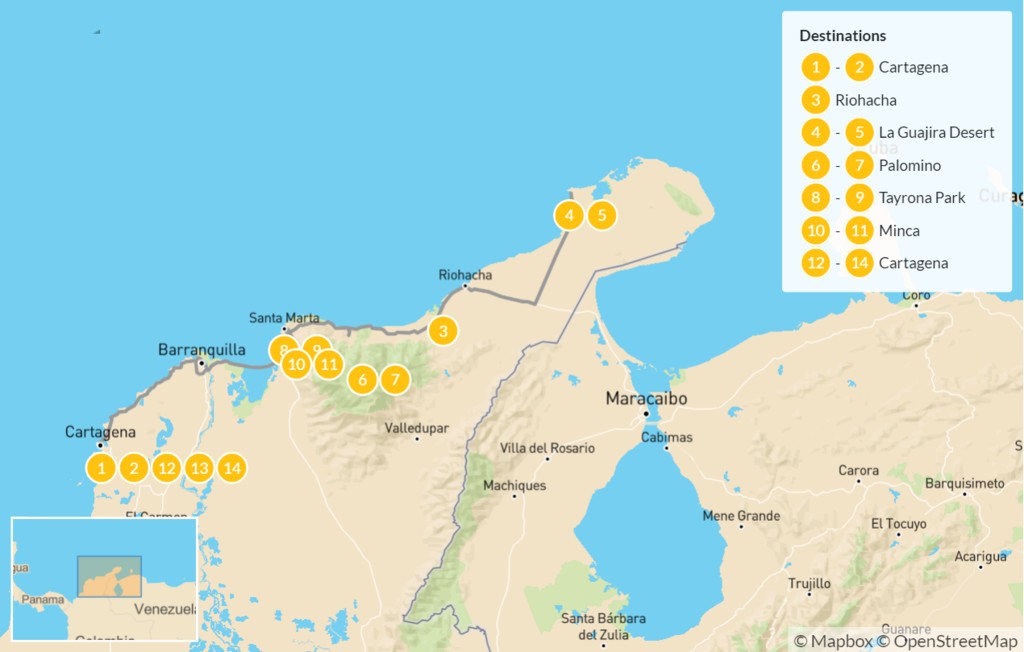 Map of Colombia’s Caribbean Coast: Tayrona, Cartagena, Rosario Islands – 15 Days