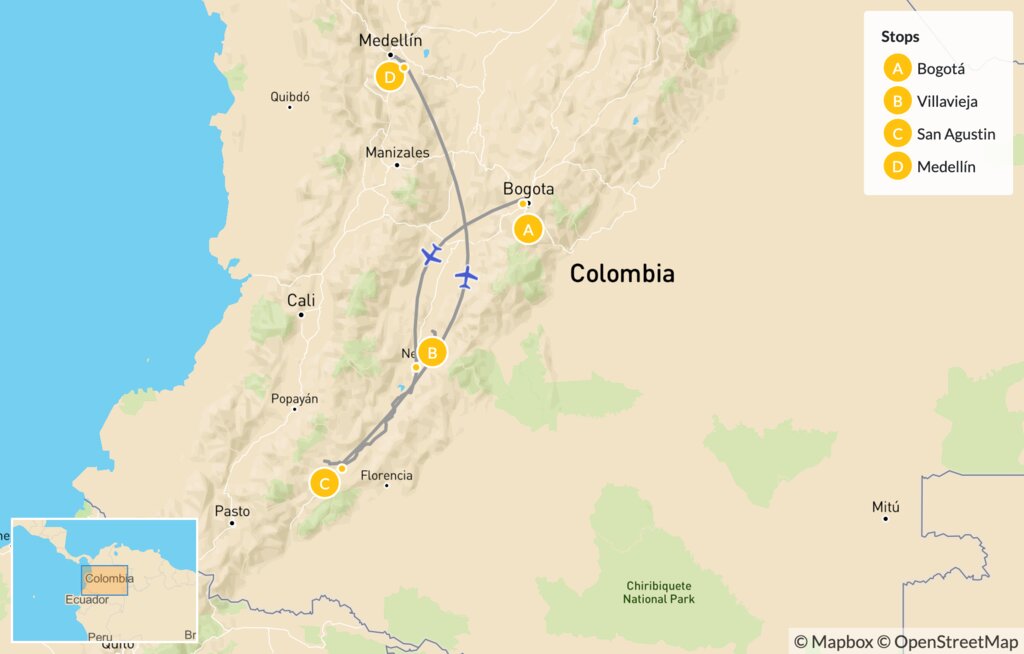 Map of Colombia’s Cities & Archaeological Wonders – 11 Days