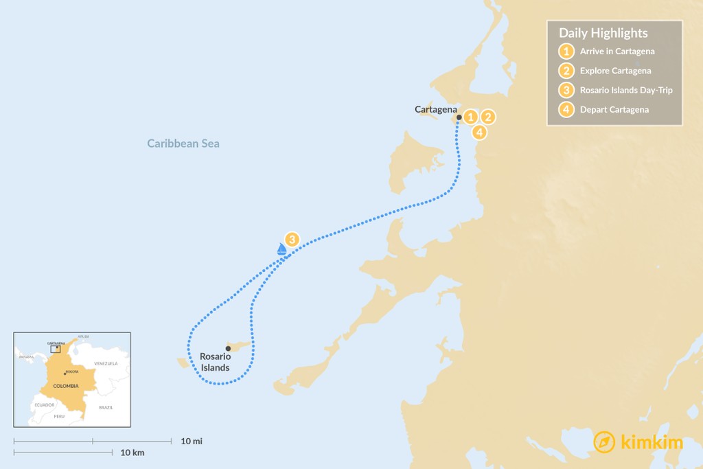 Map of Colonial Cartagena and Island Adventure – 4 Days