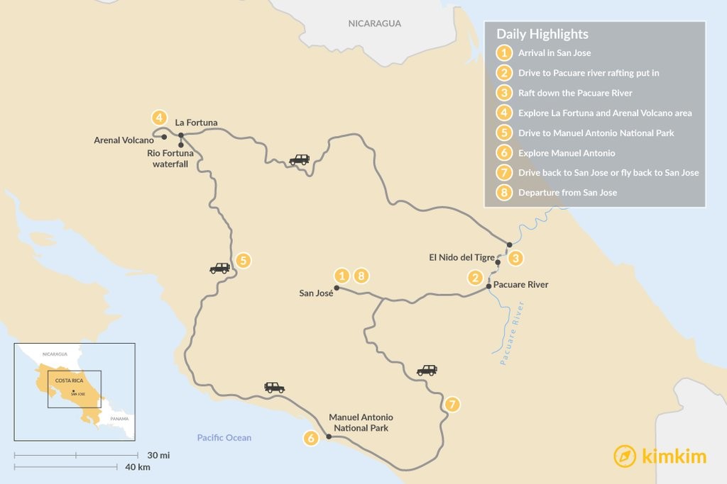 Map of Costa Rica Adventure: Whitewater, Beaches & Volcanos – 8 Days