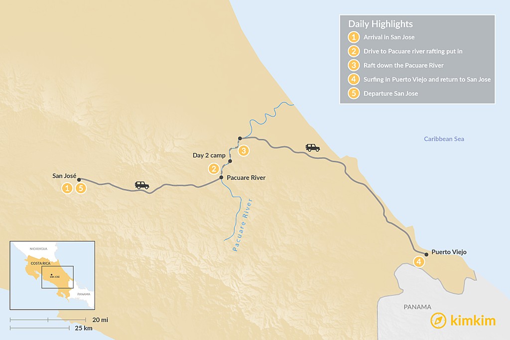 Map of Costa Rica Adventure: Whitewater Rafting & Surfing – 5 Days