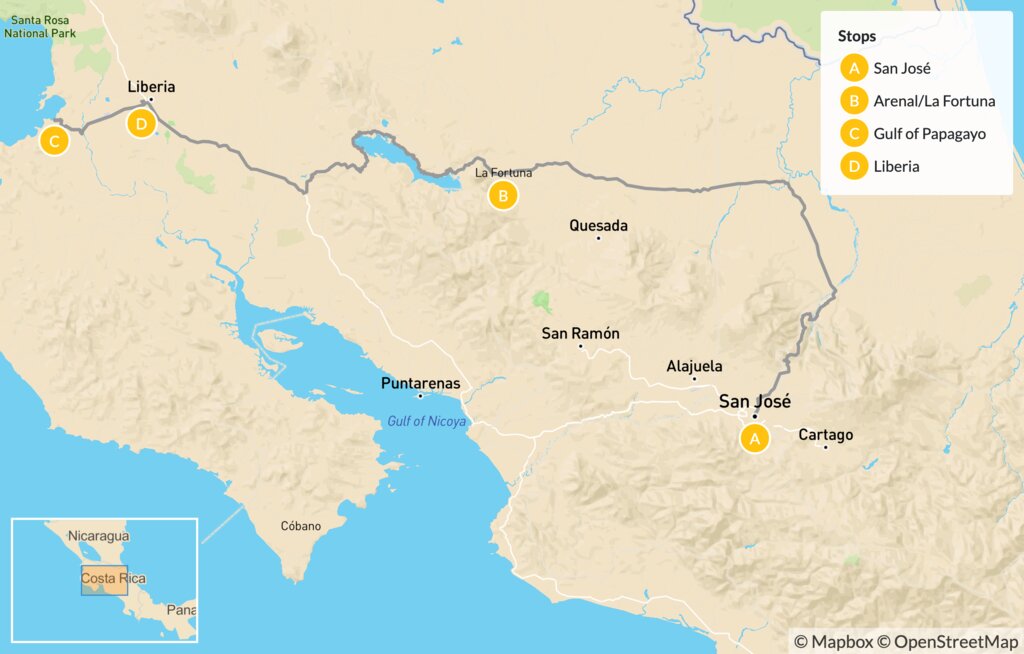 Map of Costa Rica Culinary, Nature & Beaches Tour – 8 Days
