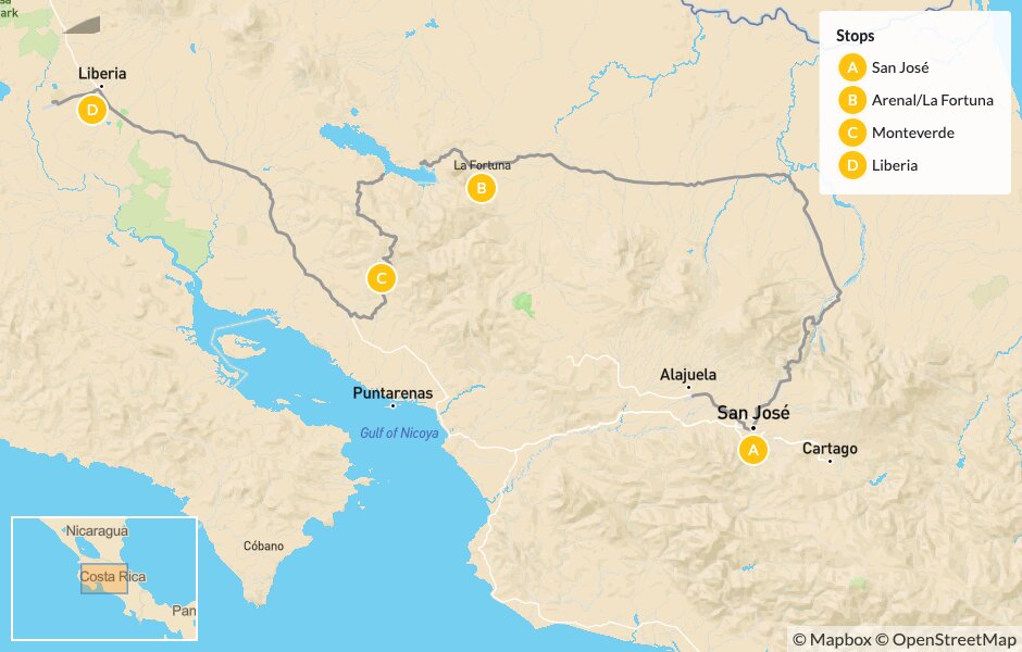 Map of Costa Rica Family Fun: Culture, Wildlife & Cloud Forests – 9 Days