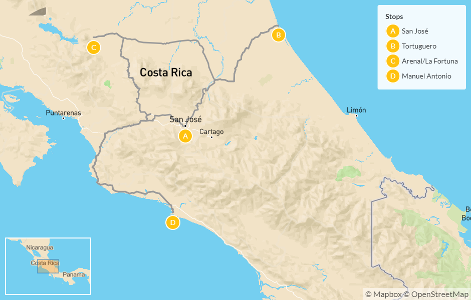 Travel from the Caribbean coast to the Pacific coast, enjoying outdoor adventures along the way, on this exciting 13-day itinerary across Costa Rica. Spend a day sightseeing in San José before heading on to Tortuguero National Park for a boat tour and a nighttime nature hike. Continue to Arenal for volcano hikes, hot springs, and a visit to a wildlife rehabilitation center, then zipline through the cloud forest in Monteverde and end the trip in Manuel Antonio National Park.