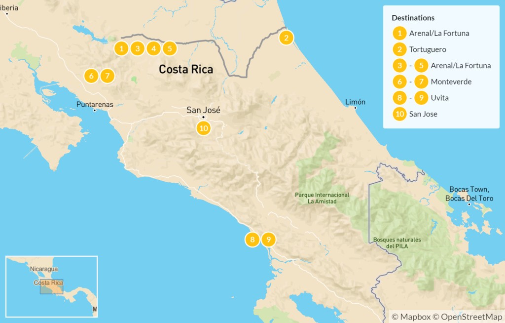 Map of Costa Rica Great Outdoors: Tortuguero, Arenal, Monteverde, & More – 11 Days