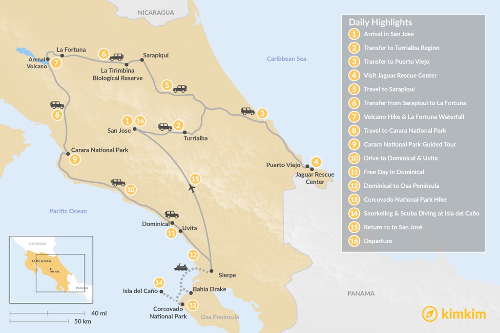 Map of Costa Rica Highlights: Self-Drive Adventure – 16 Days