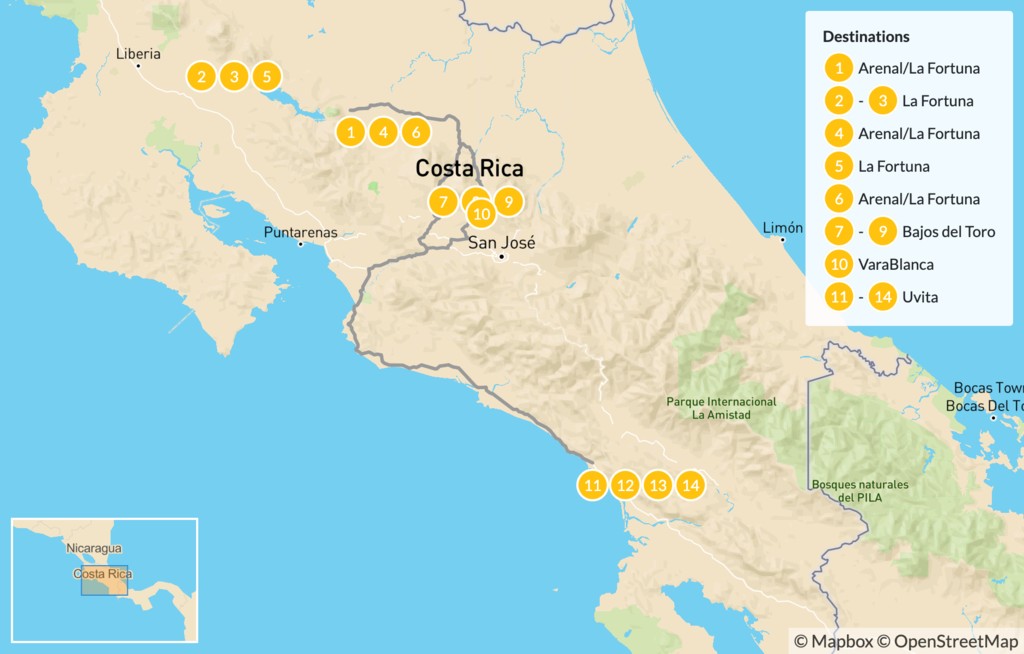 Map of Costa Rica Luxury Escape: Arenal, Bajos del Toro, & Uvita – 15 Days